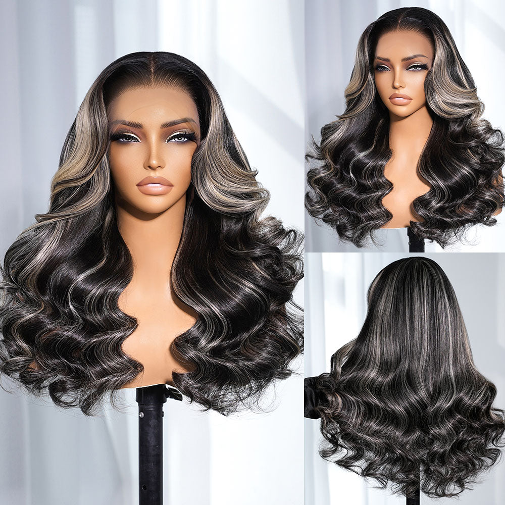 Megalook Blonde Highlights On Black 13x4 Lace Front Wigs Human Hair Body Wave/Straight Wig With Platinum Blonde Highlights