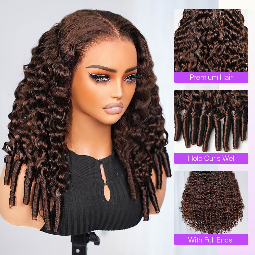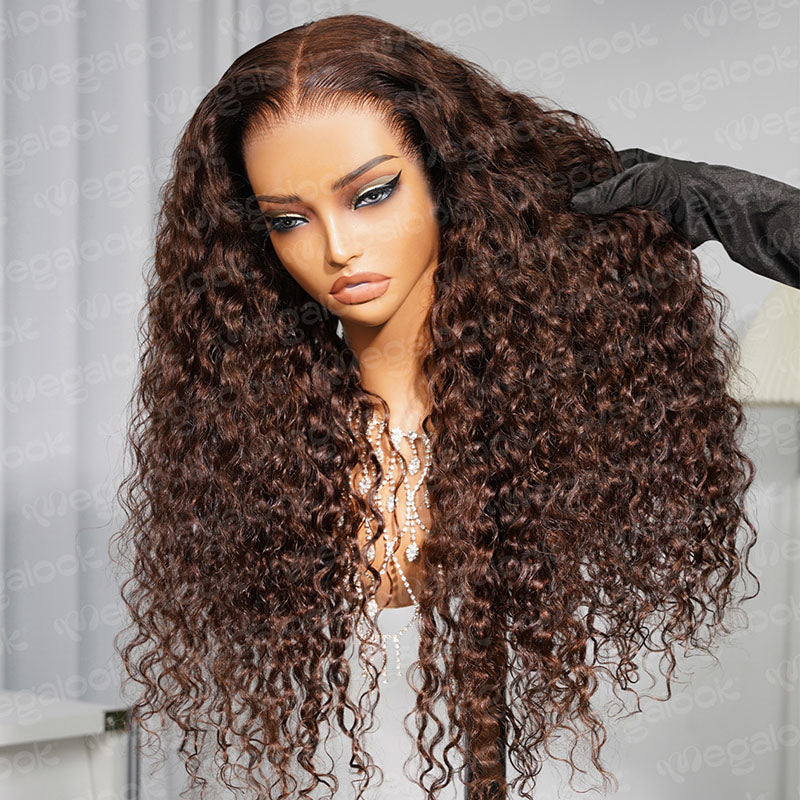 Megalook 13x6 Three-Go™ Chocolate Brown Glueless Wigs Water Wave Curly with Drawstring 100% Human Hair Wig