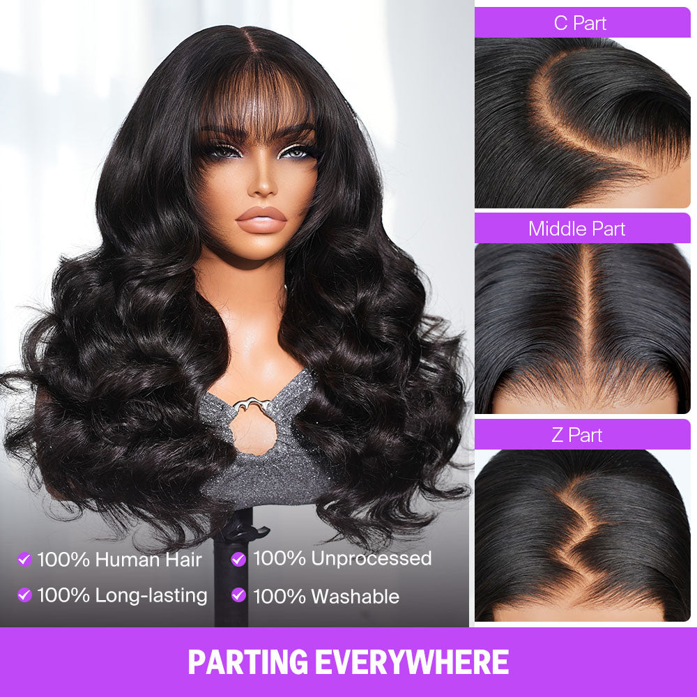 Megalook 5x5 Invisible Knots With Curtain Bang Loose Wave Natural Black Wig Pre-Cut Lace Beginner Friendly