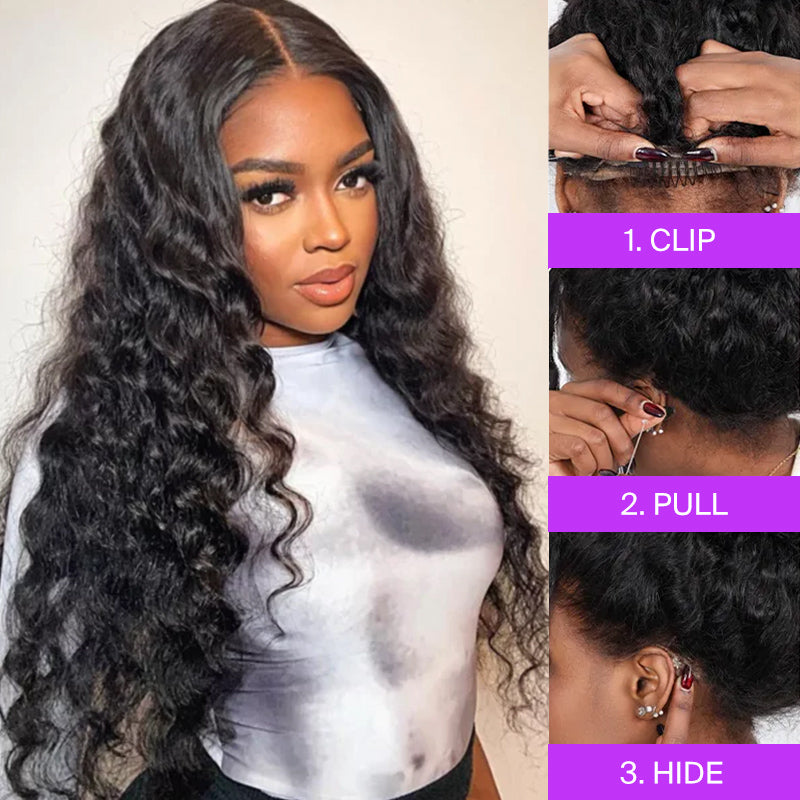 Megalook 360 Full Lace Glueless Loose Deep Wave Wigs Invisi Drawstring Natural Black Pull & Go