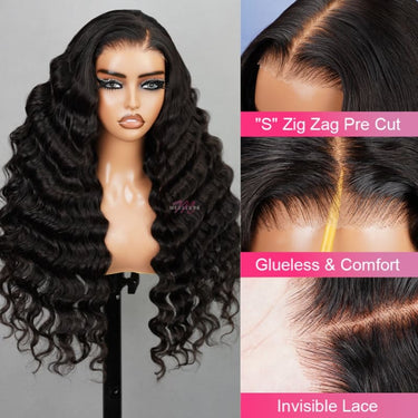 Megalook 6x5 Invisible Knots Glueless Loose Deep Wave Wigs Pre-cut Lace Natural Black Breathable Cap
